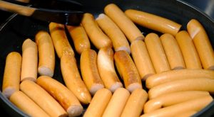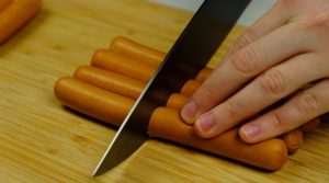 Tăiem crenvurștii în jumătate. Pentru că urmează să îi prăjim puțin ca să le dăm un gust mai bun, facem acest pas pentru a evita ca aceștia să se curbeze.