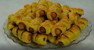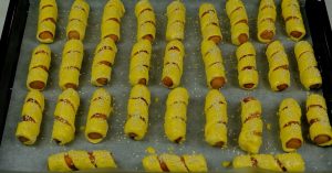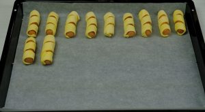 Într-o tavă de cuptor tapetată cu hârtie de copt, așezăm toți cei 30 de crenvurști în foietaj.