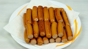 Punem crenvurștii pe un prosop de hârtie pentru a absorbi excesul de ulei și îi lăsăm să se răcească.
