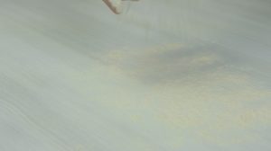 Presărăm făină pe suprafața de lucru pentru a nu se lipi aluatul. Așezăm aluatul foietaj pe blatul de lucru. Apoi, presărăm puțină făină și pe aluat.