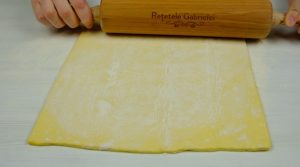 Cu ajutorul unui sucitor, întindem aluatul foarte ușor, fără a-l presa. Tăiem aluatul pe jumătate, pe lățime, iar apoi îl vom tăia în 15 fâșii de aproximativ 1,5 – 2 centimetri. Am obținut astfel 30 de fâșii de aluat foietaj.