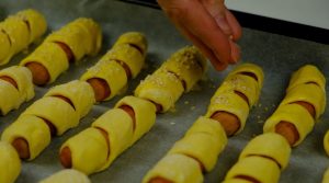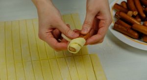 Începem să rulăm crenvurștii în foietaj și avem grijă, ca la început, să suprapunem fâșia de aluat pentru a nu se desprinde în timpul coacerii. Lăsăm puțin spațiu între aluat, pentru ca la final, după coacere, acesta să aibă o formă frumoasă. De asemenea, la final, presăm puțin aluatul pentru a evita desprinderea acestuia în cuptor.