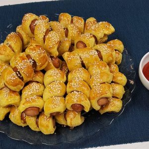 După ce crenvurștii în foietaj s-au rumenit frumos, îi lăsăm 2-3 minute în tavă și apoi îi așezăm pe un platou. Îi puteți servi cu ketchup sau cu orice alt sos doriți!